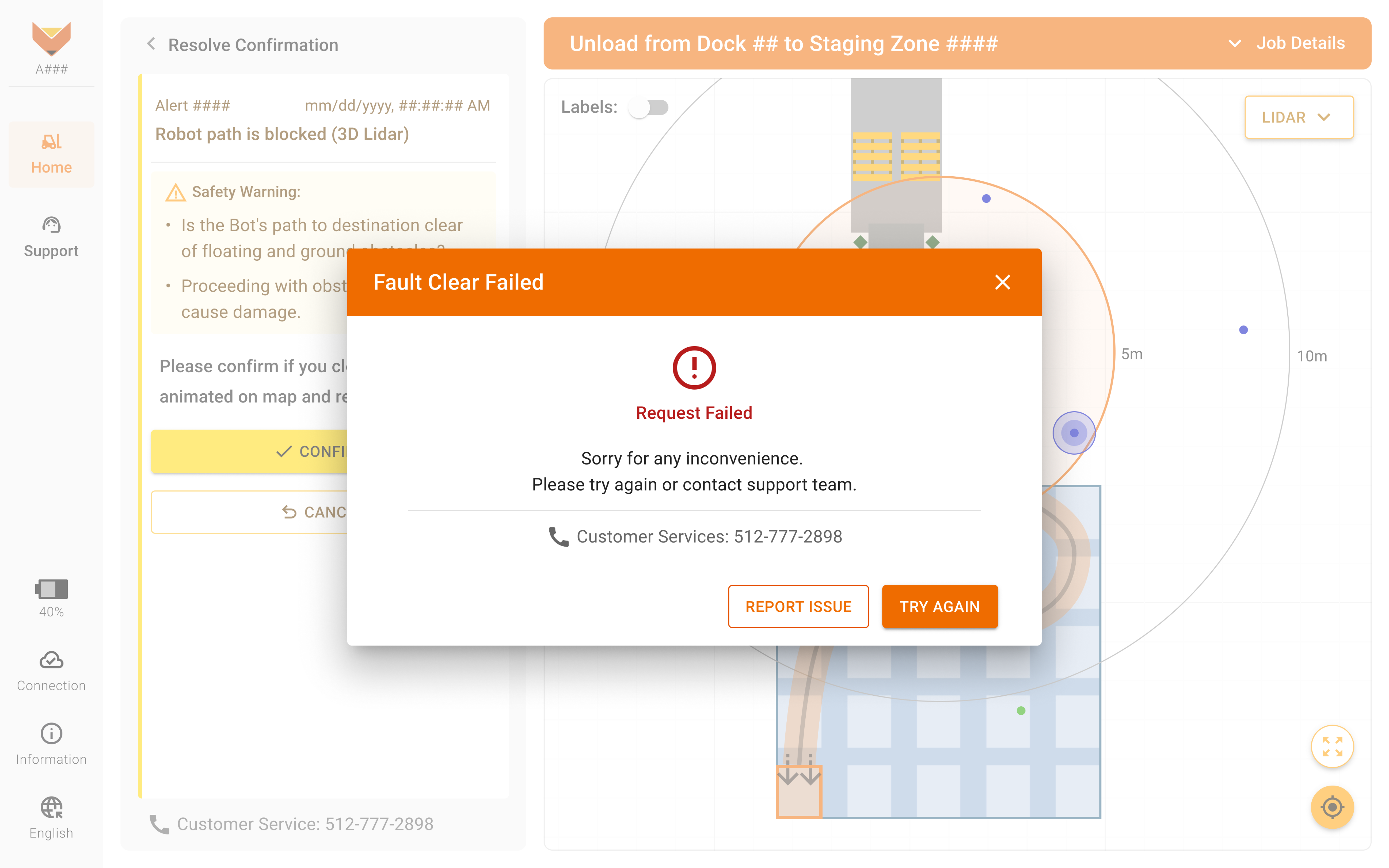 If something goes wrong, users see a clear message with a 'Report Issue' button to quickly get help—either by submitting a ticket or calling support.