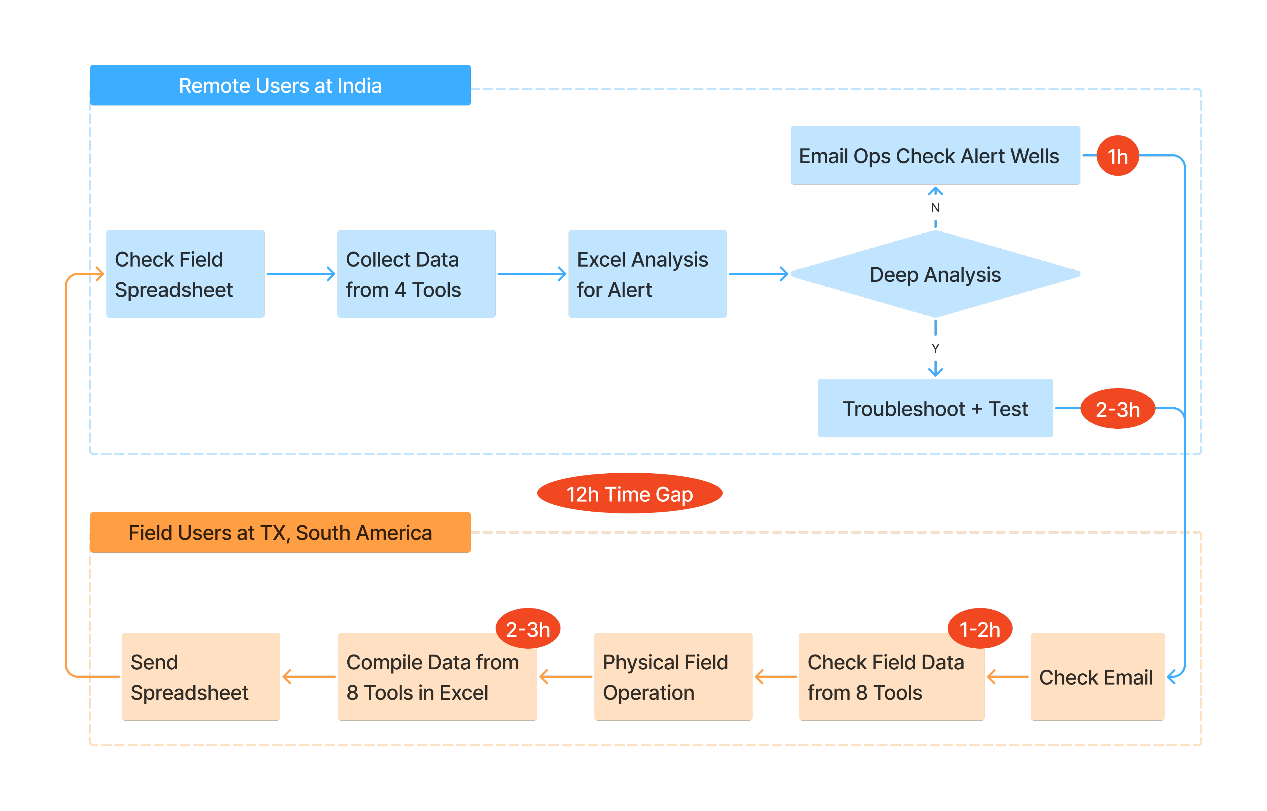The full workflow was a cycle flow between 2 user groups with 12h time zone gap across 9 tools. Data compilation process significantly decreased operation efficiency and extended the well downtime.