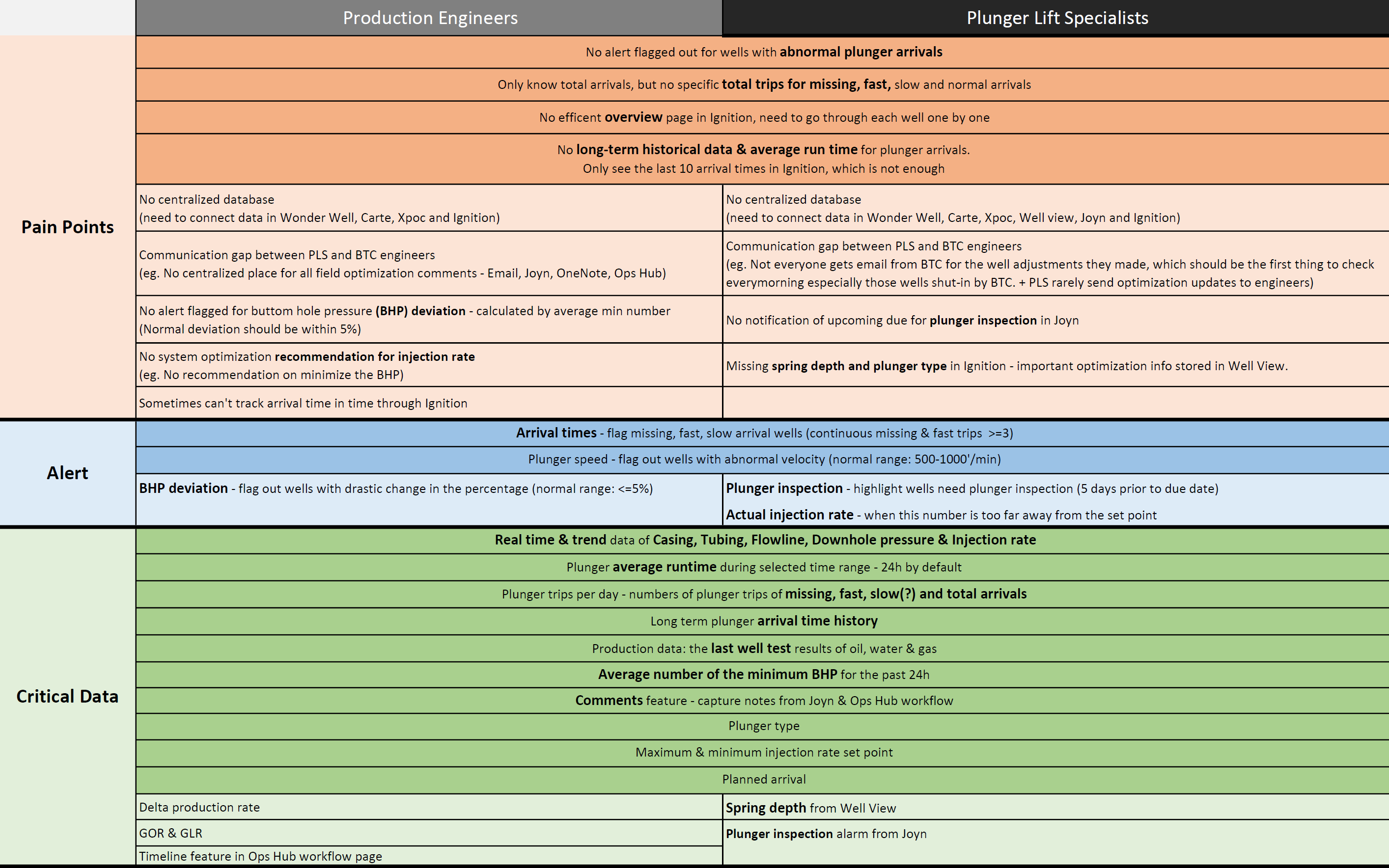 I analyzed the research findings and organized insights from two target user groups into a structured Excel spreadsheet. The data was categorized into three key areas: current pain points, alert types, and critical data used in daily plunger lift operations.